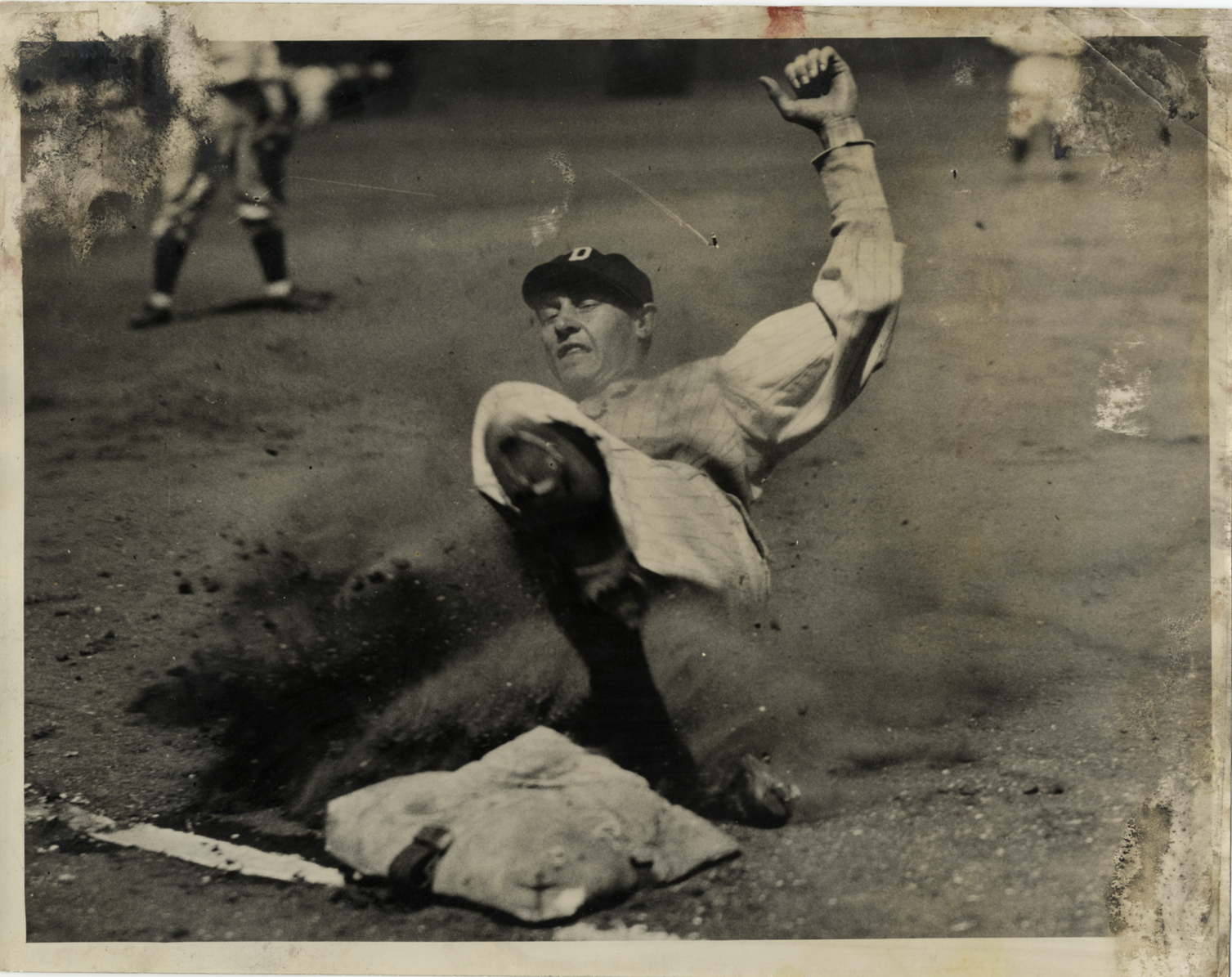 Detroit Tigers center fielder Jo-Jo White sliding into base. Handwritten on back: "Joyner White."