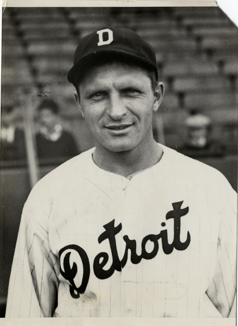 Portrait of Detroit Tigers shortstop Billy Rogell. Stamped on back: "[?] Photograph from Wide World [?]." Handwritten on back: "Bill Rogell."
