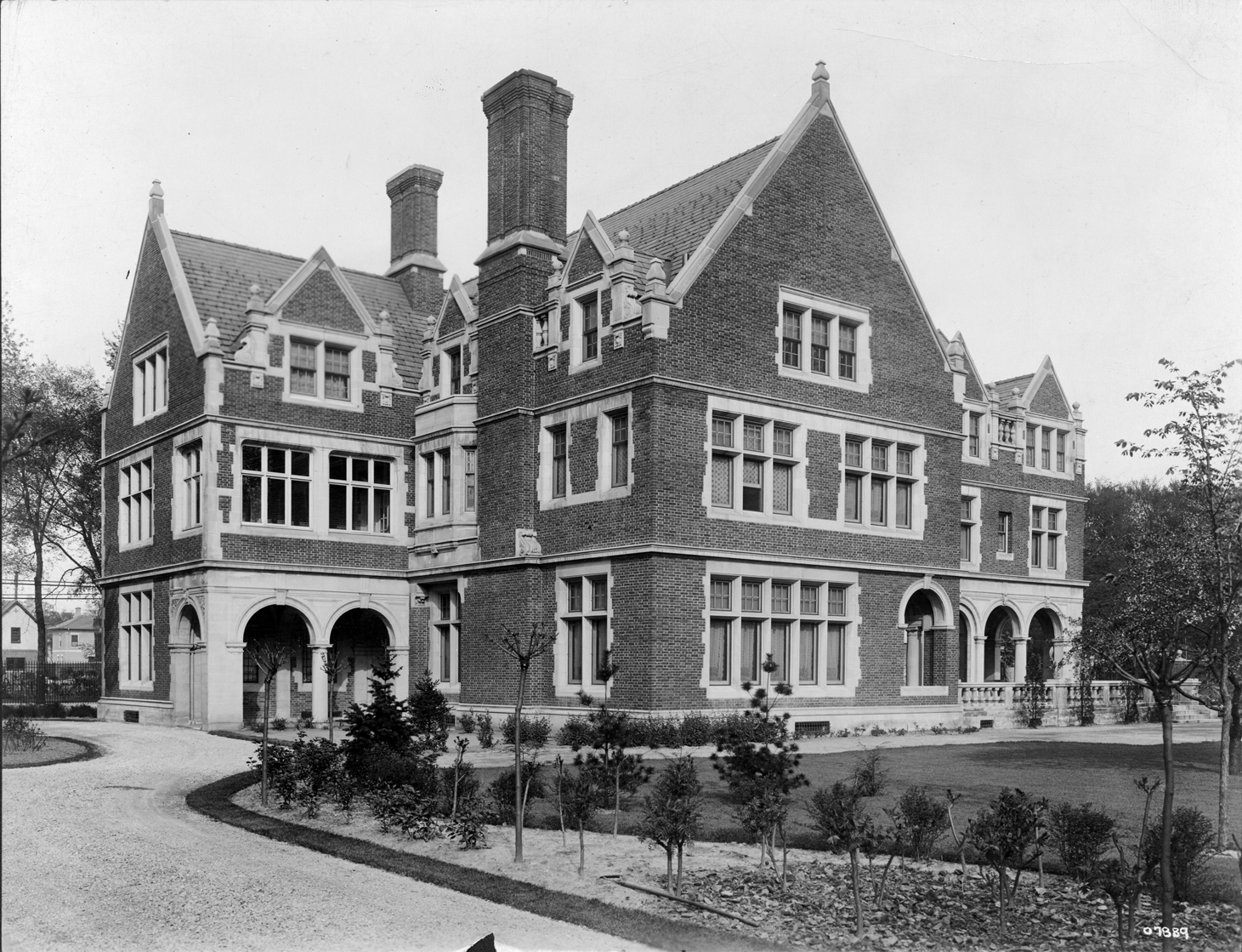 Exterior of the Early English Renaissance style Bowen residence on Woodward between Kirby and Ferry. Written on photo front "07889." Written on photo back: "Lemuel Warner Bowen Res., May 12, 1914, Spooner & Wells, Inc., photographers, Woodward Ave., Detroit, Mich."