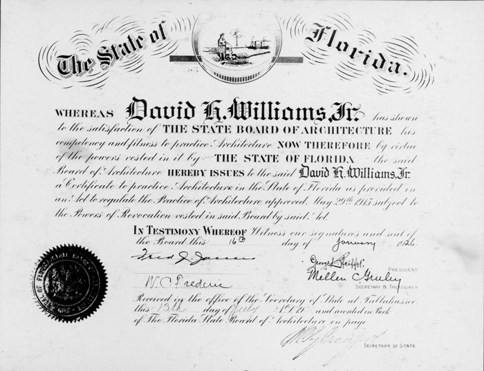 Florida architect's certificate of David H. Williams, Jr.