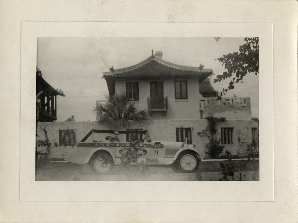 Walter Wanderwell in Ford Model A car in front of house and wall. Painted on side of car: "Work Around the World Educational Club."