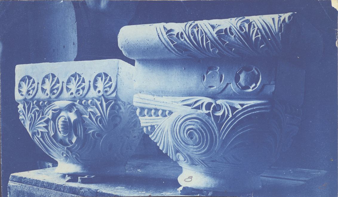 Two carved stone ornaments for exterior of the Y.M.C.A. Written on photo back: "Y.M.C.A.(old)-N.E. Corner Gr. River & Griswold."