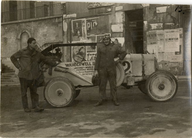 View of Walter Wanderwell and car no. 2 in Italy; unidentified man stands on left. Handwritten on back: "Italy border, 1922." Stamped on back: "H. Martin, Dec. 1922."
