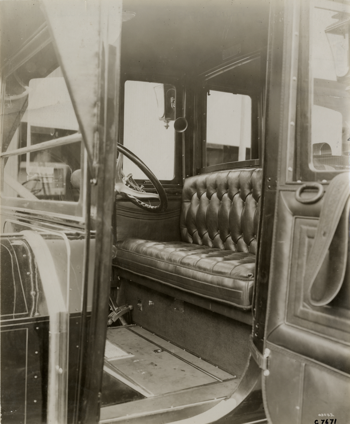 Interior view of 1912 Abbott-Detroit car, showing front seat and steering wheel. Handwritten on back: "Abbott-Detroit, 1912."