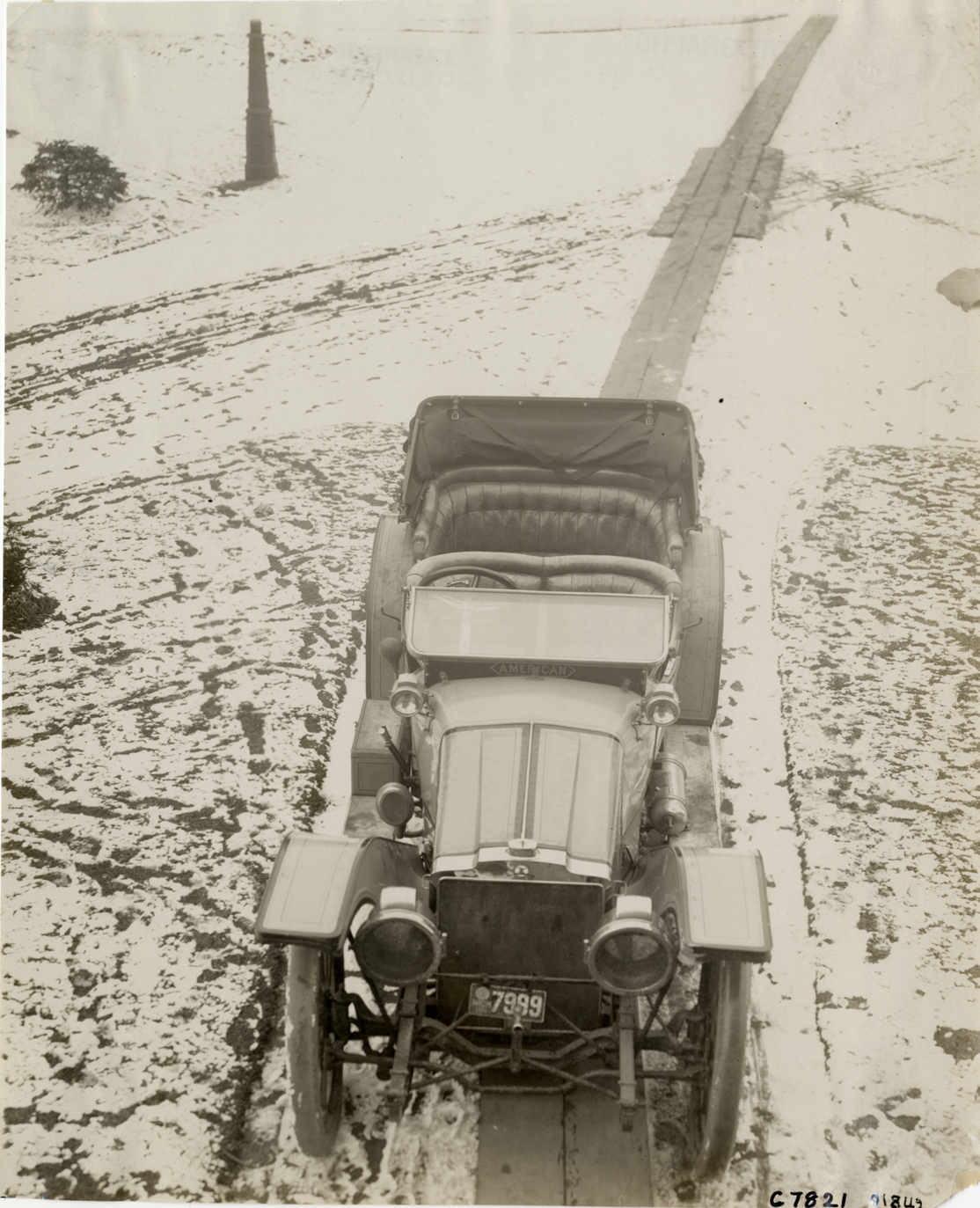 Overhead view of 1911 American car. Handwritten on back: "American, 1911."