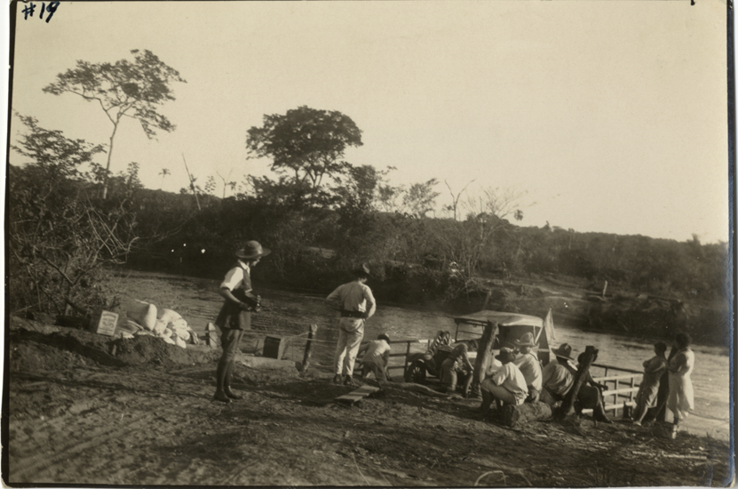 View of Wanderwell car on raft at the edge of a river in Brazil; members of Wanderwell expedition crew stand nearby.