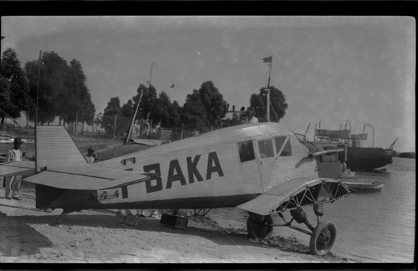 View of Junkers F-13 airplane on shoreline in Corumba, Brazil; Aloha Baker stands on wing. Handwritten on sleeve: "Curumba [sic], Mato Grosso, Brazil, Junkers F-13 Baka, open cockpit, 4 place cabin, 1930/31. Mato Grosso, South America, Brazil, 1930-31."
