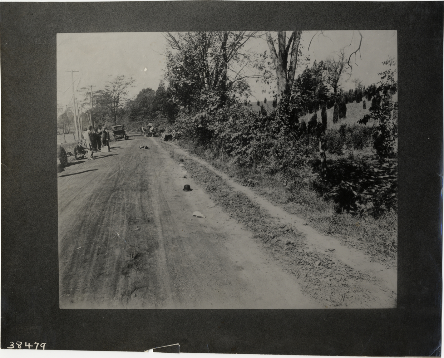 View of overturned car on side of road; group of men stand nearby. Row of hats in foreground. Stamped on back: "Spooner & Wells, Inc., photographers, telephones 3472-3473 Columbus, 1931 Broadway, New York." Handwritten on back: "Accidents, 1911."