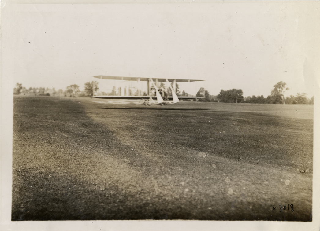View of airplane during takeoff at Grosse Pointe aviation meet. Stamped on back: "Spooner & Wells, Inc., photographers, 1231 Woodward Ave., Detroit, Mich., telephone North 1745." Handwritten on back: "Aircraft competitions--Grosse Pointe aviation meet, 1911. Phelys McMillan alighting." Label on file: "Regarding the Grosse Pointe file. The aviation event took place at the then Grosse Pointe Golf Club, now the site of the Grosse Pointe High School. The occasion was the result of Russell A. Alger's effort to bring the Wright airplane to Detroit. Alger was a founder of the Detroit Aviation Society and an investor in the Wright Airplane Co. The planes [sic] pilot, Frank R. Coffyn, took 41 high status passengers aloft during the period, June 18-20, 1911. Later Alger bought the plane and had Coffyn teach him to fly it."
