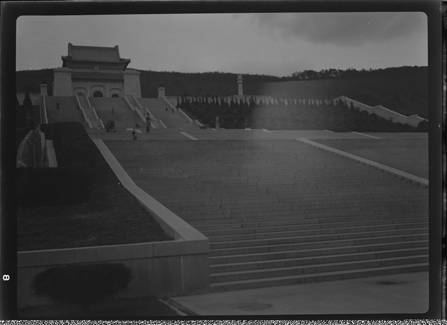 View of Aloha Baker on steps of temple in China. Handwritten on sleeve: "Local culture, scenic spots, Asia, China, 1924."