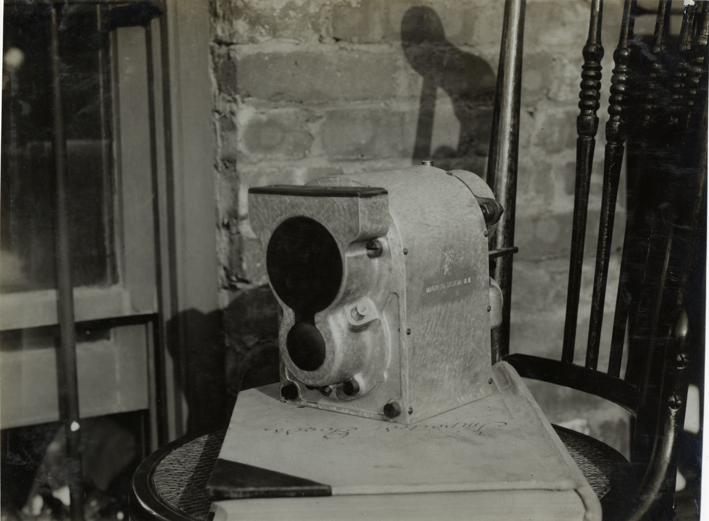 View of magneto for automobile. Embossed on side of device: "Magneto Systeme." Stamped on back: "Photo by F. Ed. Spooner, 1536 B'way, telephone 6536-38th St., New York, N.Y." Handwritten on back: "Accessories--Electrical magnetos, 1906."