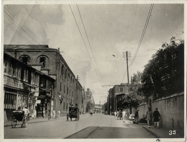 View of pedestrians walking along street in Shanghai, China. Rickshaw in foreground. Handwritten on back: "A view looking west on East Broadway, Shanghai?"