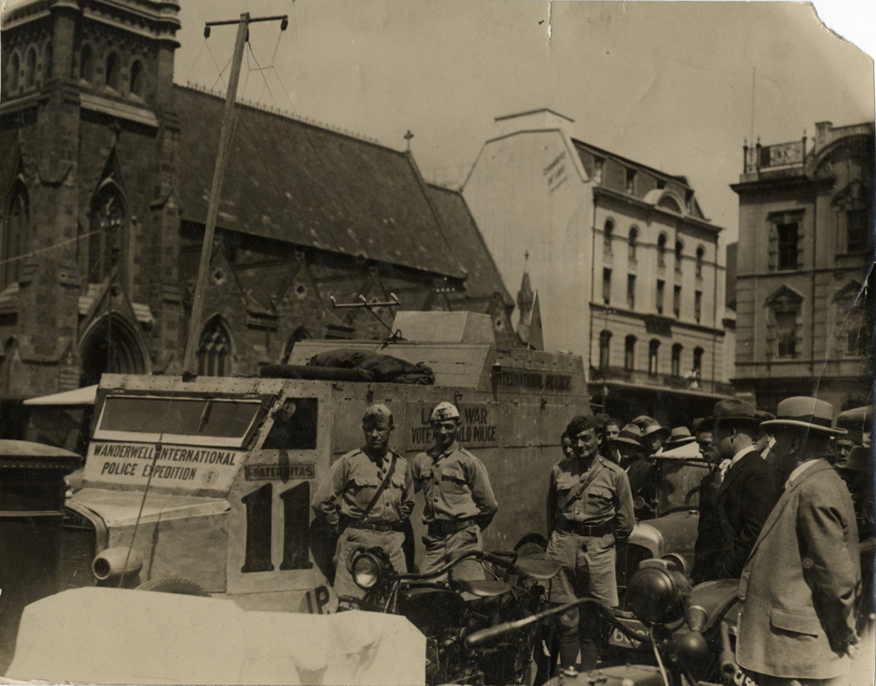 View of Walter Wanderwell, Eric Owen and members of Wanderwell expedition posing with car no. 11 and motorcycles in South Africa. Onlookers surround car; church and other buildings in background. Handwritten on back: "Left, Owen & Cap'n W, S. Africa, 1927."