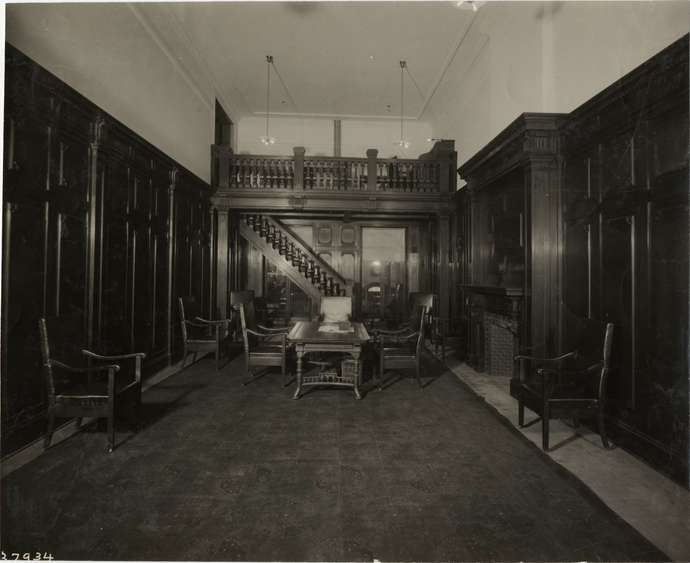 View of wood-paneled living room with fireplace. Room is furnished with table and armchairs; staircase and balcony in background. Stamped on back: "Spooner & Wells, Inc., photographers, telephones 3472-3473 Columbus, 1931 Broadway, New York." Handwritten on back: "Architecture--Domestic, 1910."