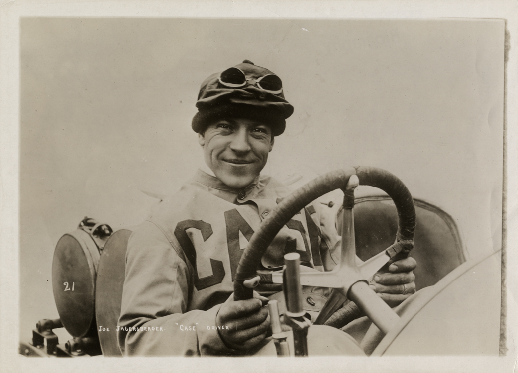 Portrait of driver Joe Jagersberger, sitting in racecar. Printed on front: "Joe Jagersberger, 'Case' driver." Handwritten on back: "Biography--Jagersberger, Joe. 'Case' driver."