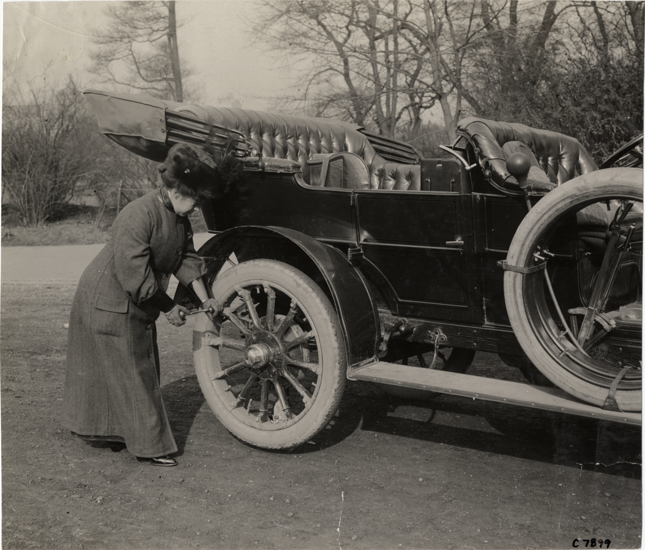 View of Joan Cuneo changing a tire. Handwritten on back: "Biography--Joan Cuneo, changing a tire."