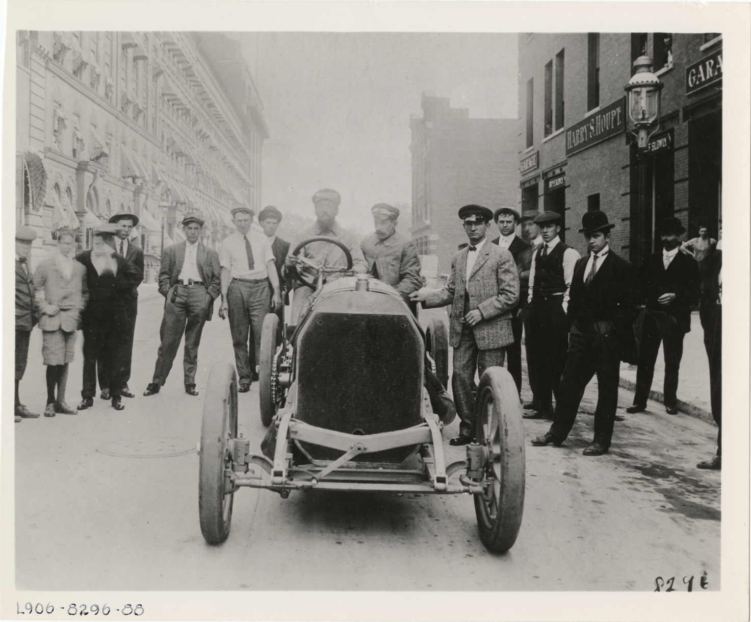 View of driver Hubert LeBlon, seated in Thomas racecar, during the 1906 Vanderbilt Cup races. Group of men stand in background. Typed on back: "Hubert LeBlon in a Thomas, Vanderbilt, 1906." Handwritten on back: "Biography--LeBlon, Hubert."