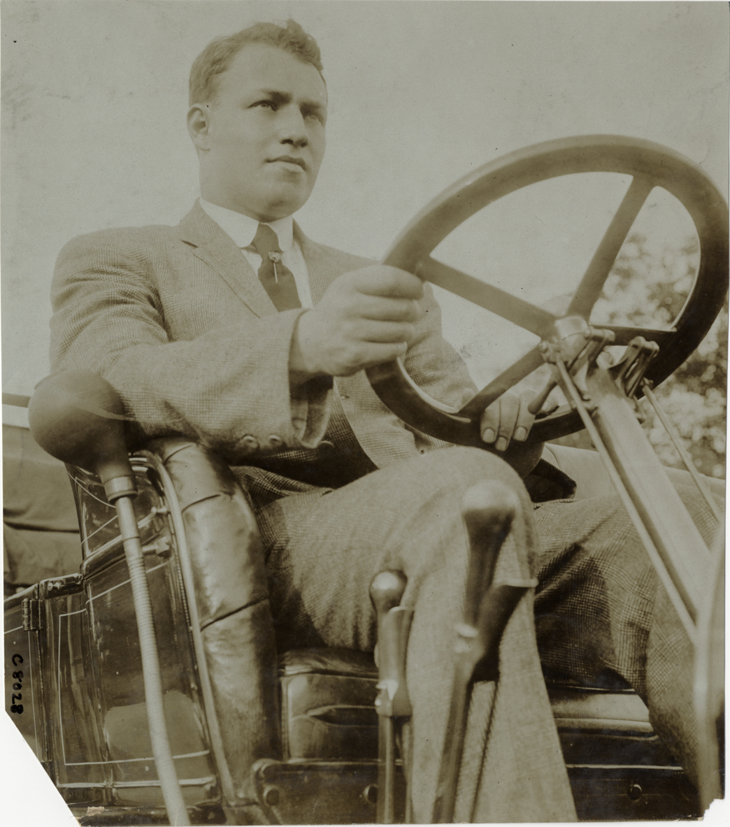 Portrait of driver George Robertson, sitting in car. Handwritten on back: "Biography--George Robertson, 1906. 1906 Vanderbilt Cup driver."