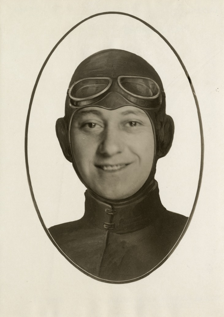 Portrait of Arthur Klein. Typed on back: "Arthur Klein, driver of the King Oriole which he entered in the Indianapolis 500 mile race after superintending the construction of the car from the start. Mr. Klein is truly the 'Dark Horse' of the race and in his training at the track has taken the 'Rail Birds' by storm through the speed he has shown in taking the banks, oftentimes entering the dangerous turns at 90 miles and more per hour. Klein, in answer to all questions, invariably replied that it was the cantilever springs in the rear, a feature of the King touring car, that were responsible, and so enthusiastic was young Mr. Klein about this feature of his car that he became known as 'Kantilever Klein' before he had been at the track very long." Handwritten on back: "Biography--Klein, Arthur."