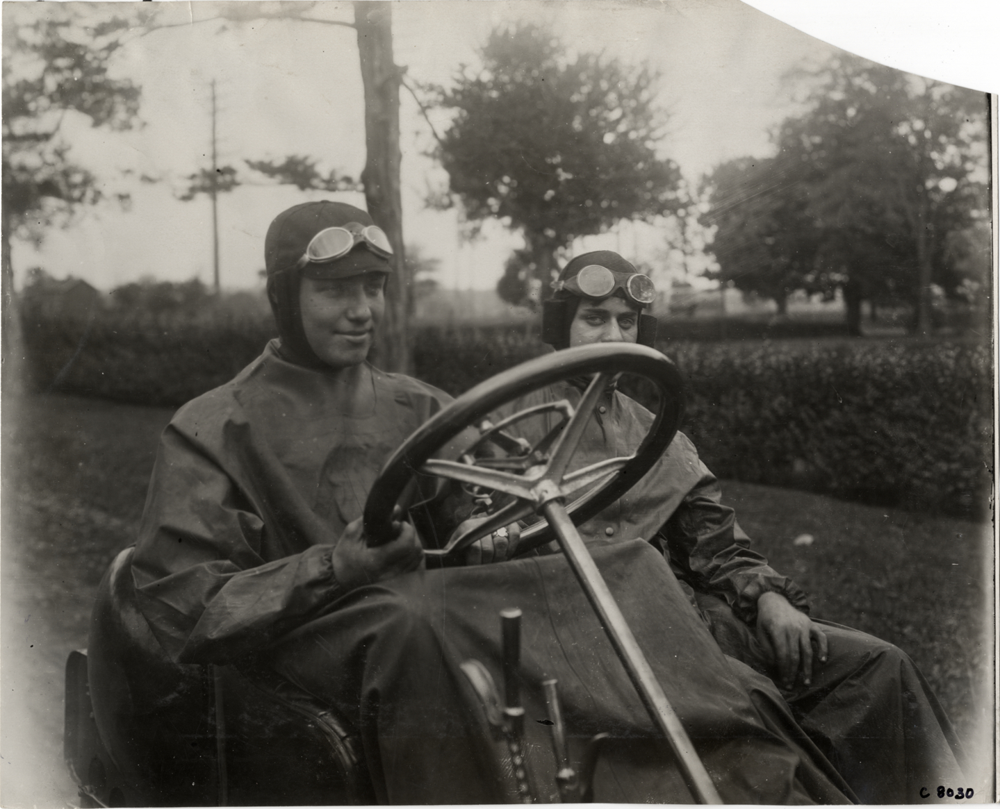 View of driver George Robertson and passenger in racecar. Stamped on back: "Spooner and Wells, 1931 Broadway, New York, duplicates any time, enlargements all sizes, tel. 3472-3473 Col., credit appreciated." Handwritten on back: "Biography--George Robertson, taken at the Briarcliff races in 1908."