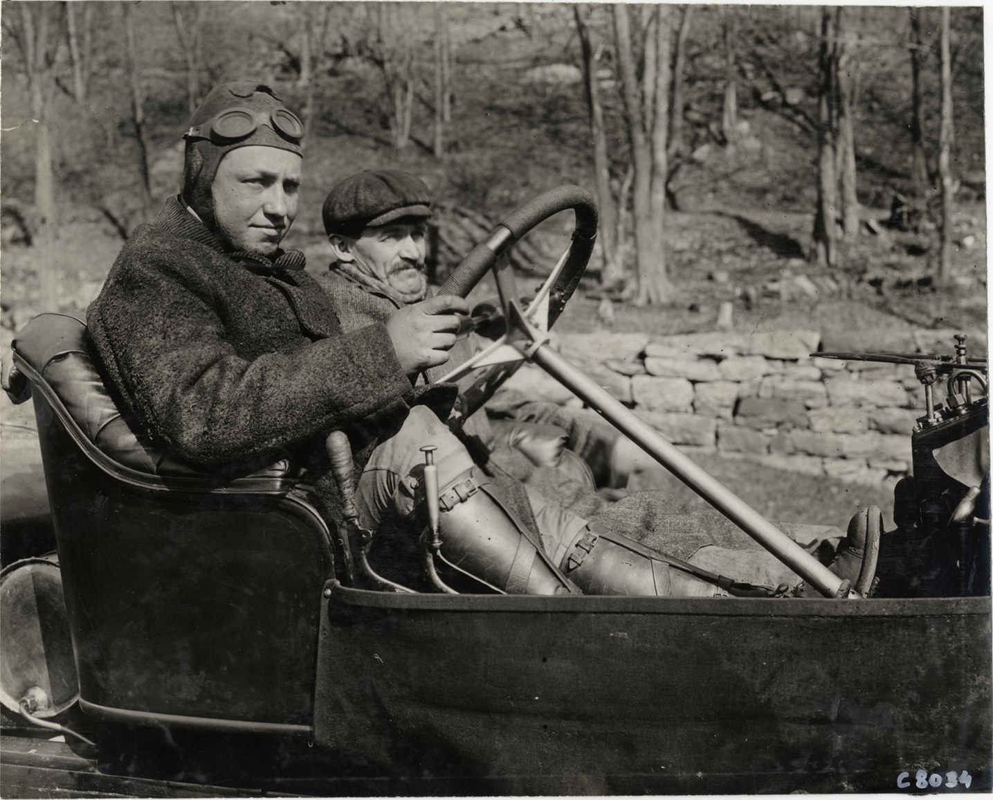 View of driver George Robertson and passenger in racecar. Handwritten on back: "Biography--George Robertson, taken at the Briarcliff races in 1908."