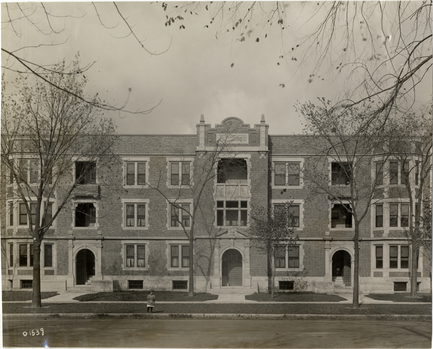View of Robertson Apartments. Three-story brick building has bay windows; "Robertson" inscribed above entrance. Girl stands in front of building. Handwritten on back: "Architecture--Domestic. Robertson Apartments, John R & Grand Blvd., Detroit, Mi., 1911."