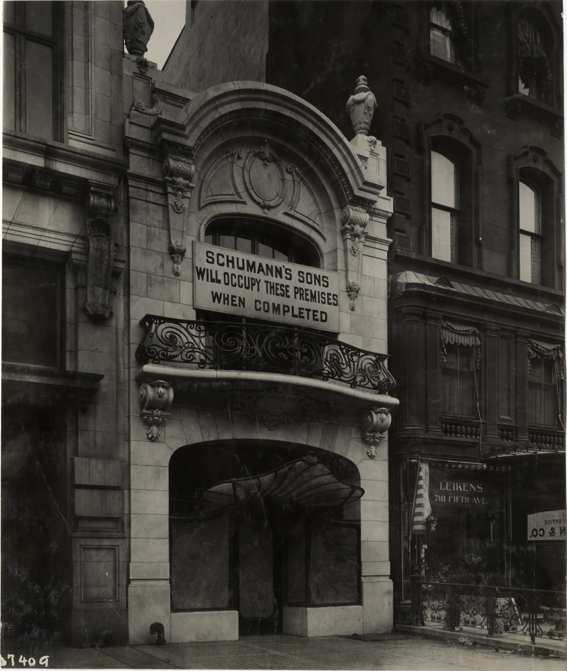 View of Schumann's Sons building. Facade of Art Nouveau style building has stone facade with curved awning and ornate balcony. Sign on building: "Schumann's Sons will occupy these premises when completed." Stamped on back: "Spooner & Wells, Inc., photographers, telephones 3472-3473 Columbus, 1931 Broadway, New York." Handwritten on back: "Architecture--Domestic, 1910."