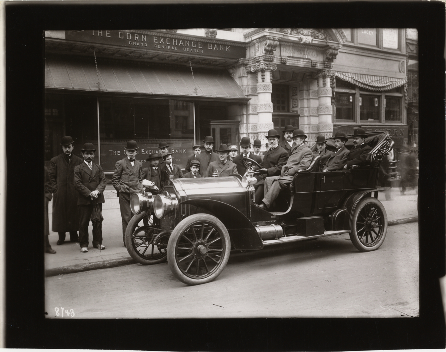 View of George Pope and E.R. Hollenden with passengers in car parked in front of Corn Exchange Bank building. Men and boys stand on sidewalk. Stamped on back: "Photographic illustration by Nick Lazarnick, 230 Park Ave., N.Y." Handwritten on back: "Biography--Pope, George. Col. George Pope at wheel, E.R. Hollenden (Fiat) in front of 7 E. 42 St., N.Y."