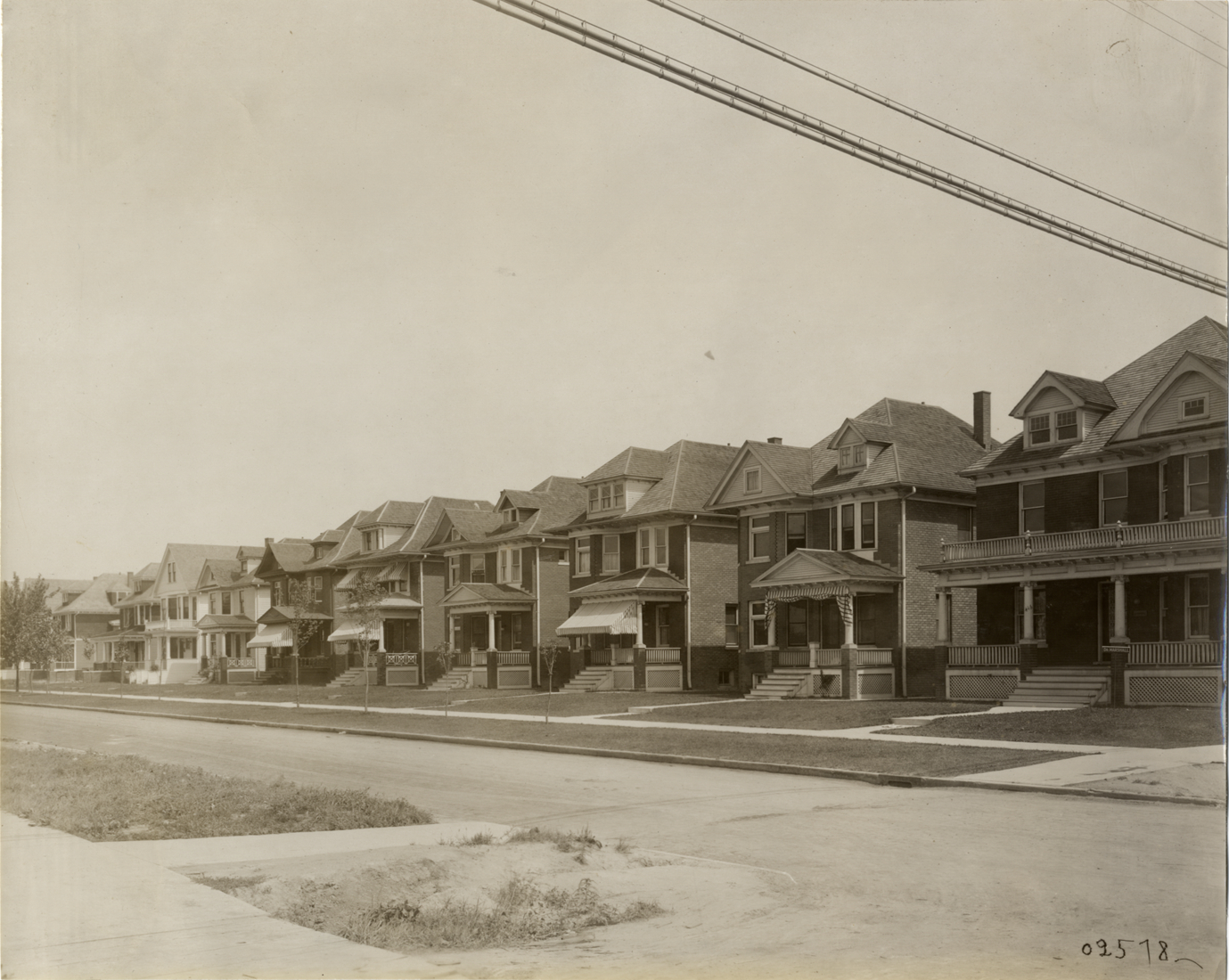 View of row of brick and wooden-frame houses in neighborhood. Handwritten on back: "Architecture--Domestic, 1911."