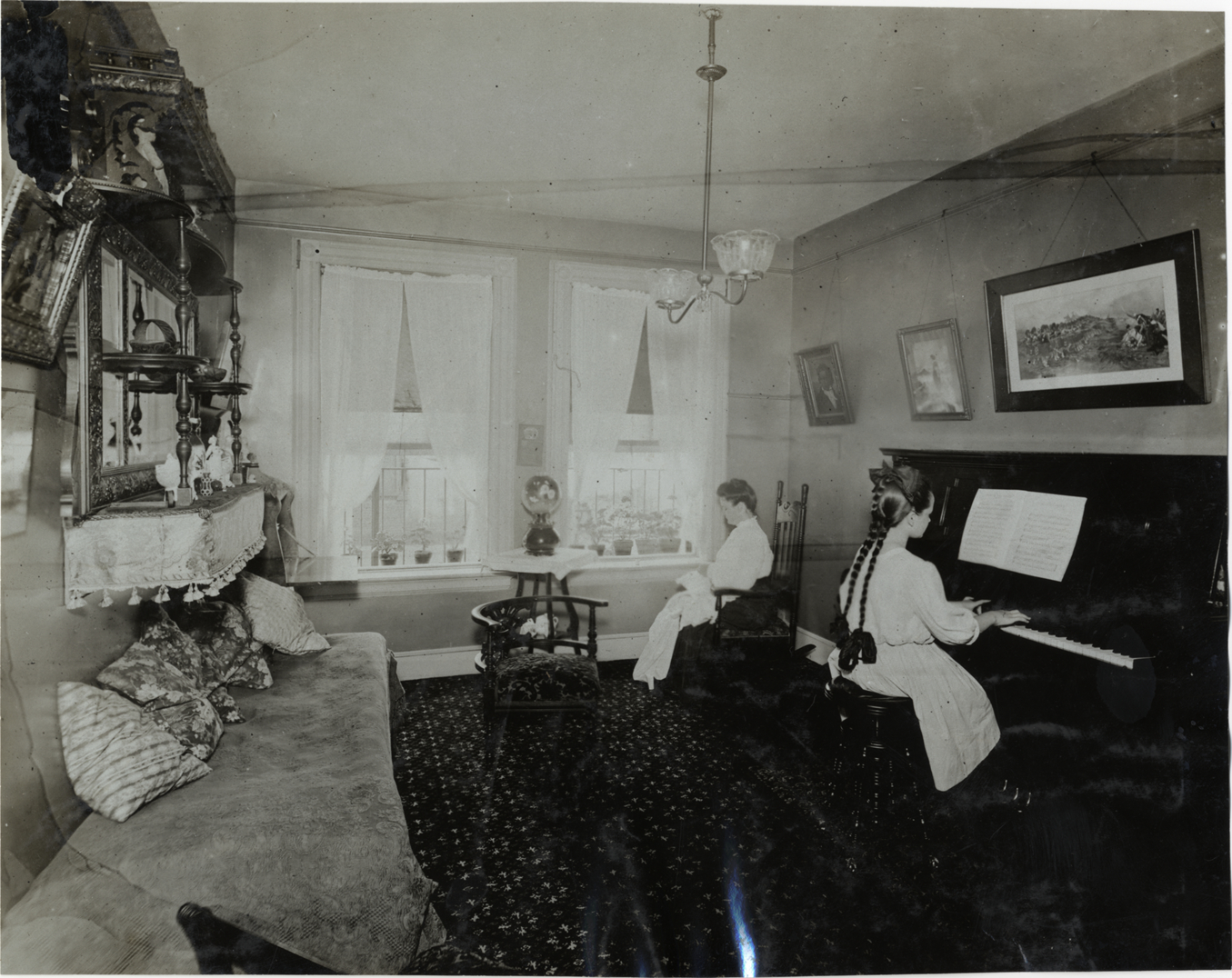 View of girl playing piano in living room; woman sits in rocking chair near window. Room is furnished with sofa, chairs, artwork and shelves. Handwritten on back: "Architecture--Domestic, 1906."