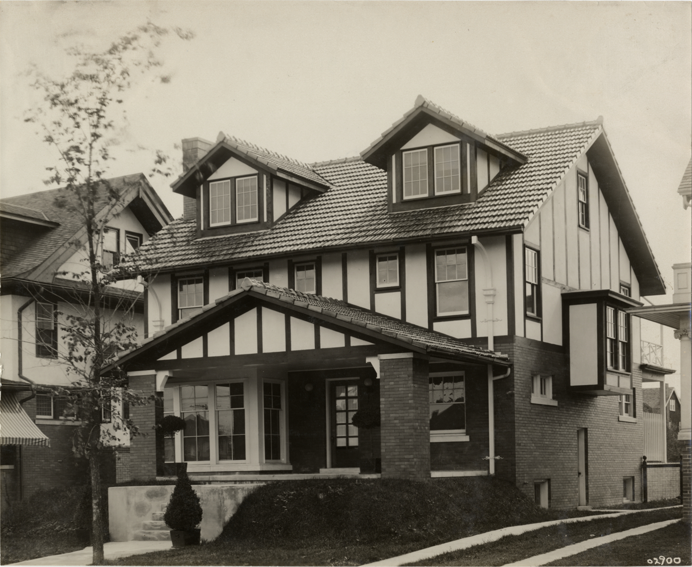 View of Tudor style two-story house with brick wall cladding, half-timbering details on second level, covered entry porch, tile roof and roof dormers. Handwritten on back: "Architecture, Domestic, 1911. Highland Park, Mi."