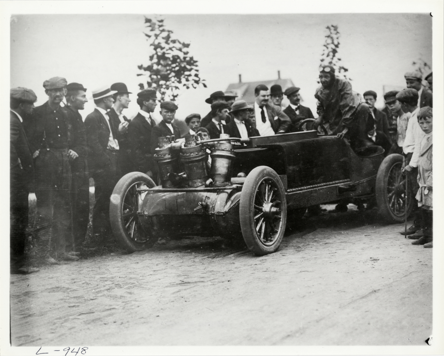 View of driver George Robertson in Christie racecar. Typed on back: "#948, George Robertson in a Christie." Handwritten on back: "Biography--Robertson, George."