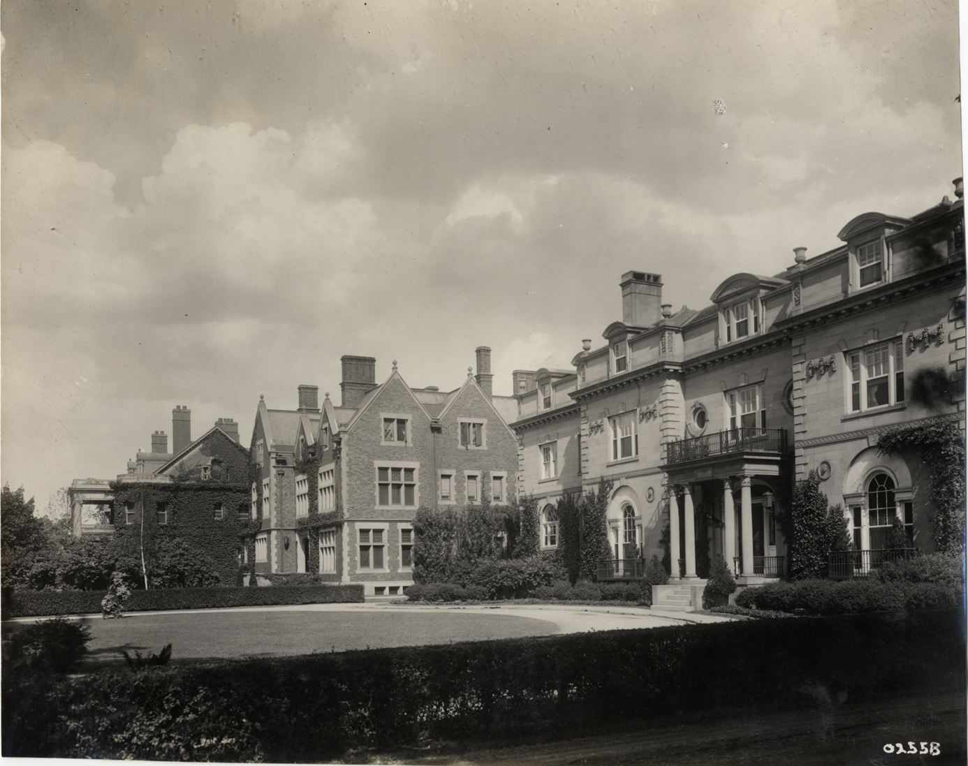 View of Beaux Arts two-story stone house. Columns support covered entry porch; other houses in background. Handwritten on back: "Architecture--Domestic, 1911."