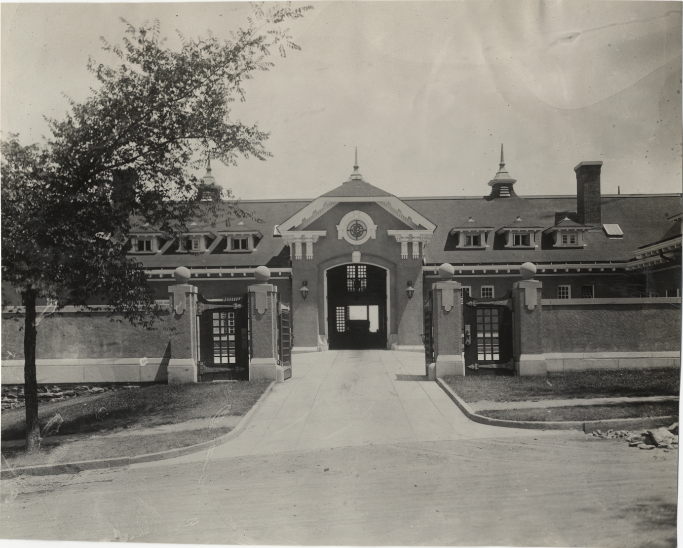 View of stable building and gate. Handwritten on back: "Architecture--Domestic, 1908."
