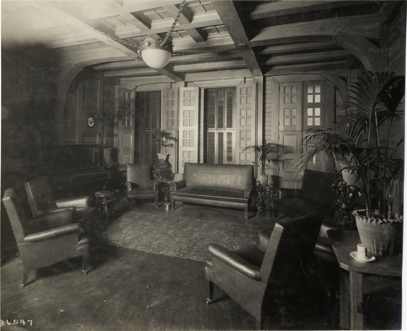 View of wood paneled sitting room or lounge area furnished with sofas, armchairs, plants and piano. Stamped on back: "Spooner & Wells, Inc., photographers, telephones 3472-3473 Columbus, 1931 Broadway, New York." Handwritten on back: "Architecture--Domestic, 1910."