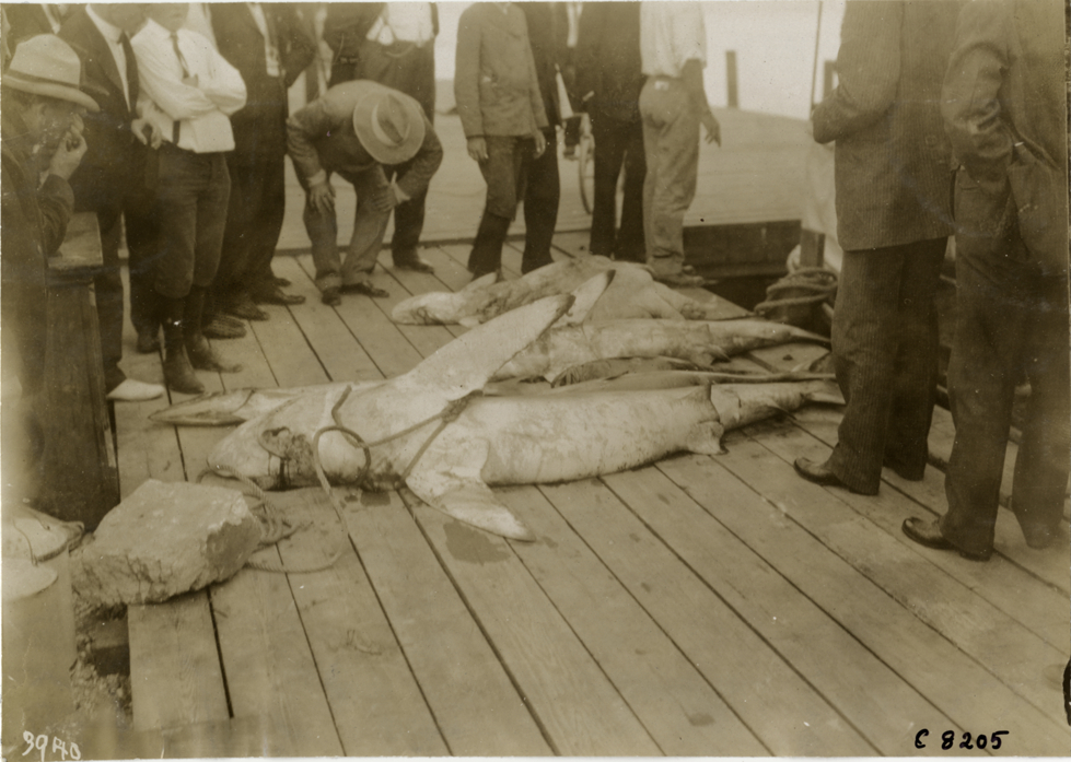 View of group of men looking at several dead sharks on dock at Palm Beach boat carnival. Handwritten on back: "Boats and boating--Palm Beach water boat carnival, 1905."
