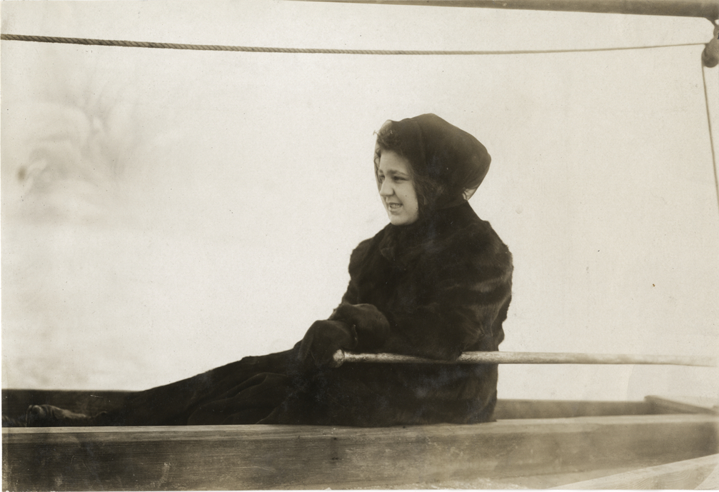 View of Rose Vernier sitting in ice boat on Lake St. Clair. Handwritten on back: "Boats and boating--Ice boating, Lake St. Clair, 1910. Ice boating on Lake St. Clair. Rose Vernier."