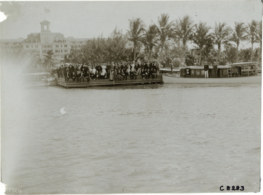 View of spectators watching boat races at Palm Beach boat carnival. Two men stand on houseboat next to shore; building and palm trees in background. Stamped on back: "Photo by N. Lazarnick, 29 West 42nd Street, New York." Handwritten on back: "Boats and boating--Palm Beach water boat carnival, 1905. Crowd watching race at Palm Beach."