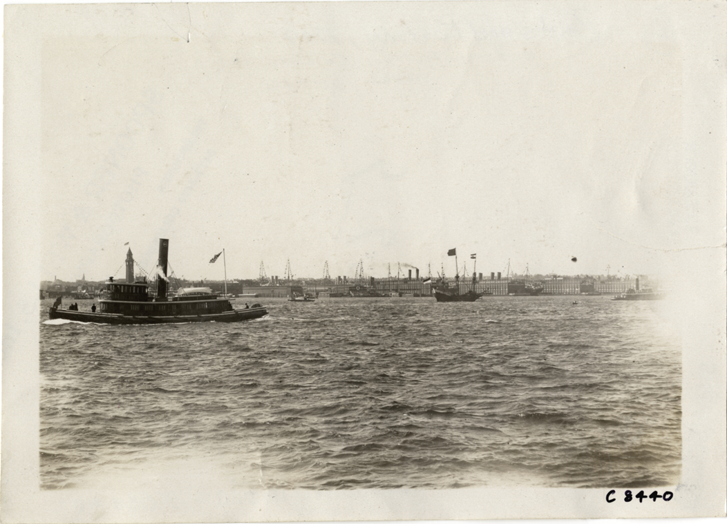 View of sailing ship "Half Moon" and tugboat on river during naval parade at Hudson-Fulton Celebration. Stamped on back: "Spooner & Wells, Inc., photographers, telephones 3472-3473 Columbus, 1931 Broadway, New York." Handwritten on back: "Boats and boating--Hudson-Fulton Celebration, naval parade, 1909."