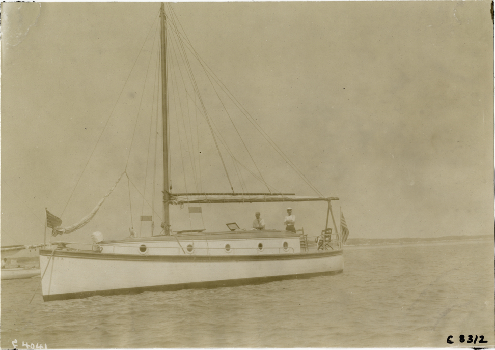 View of sailboat at Palm Beach boat carnival. Stamped on back: "Photo by N. Lazarnick, 29 West 42nd Street, New York." Handwritten on back: "Boats and boating--Palm Beach water boat carnival, 1905."