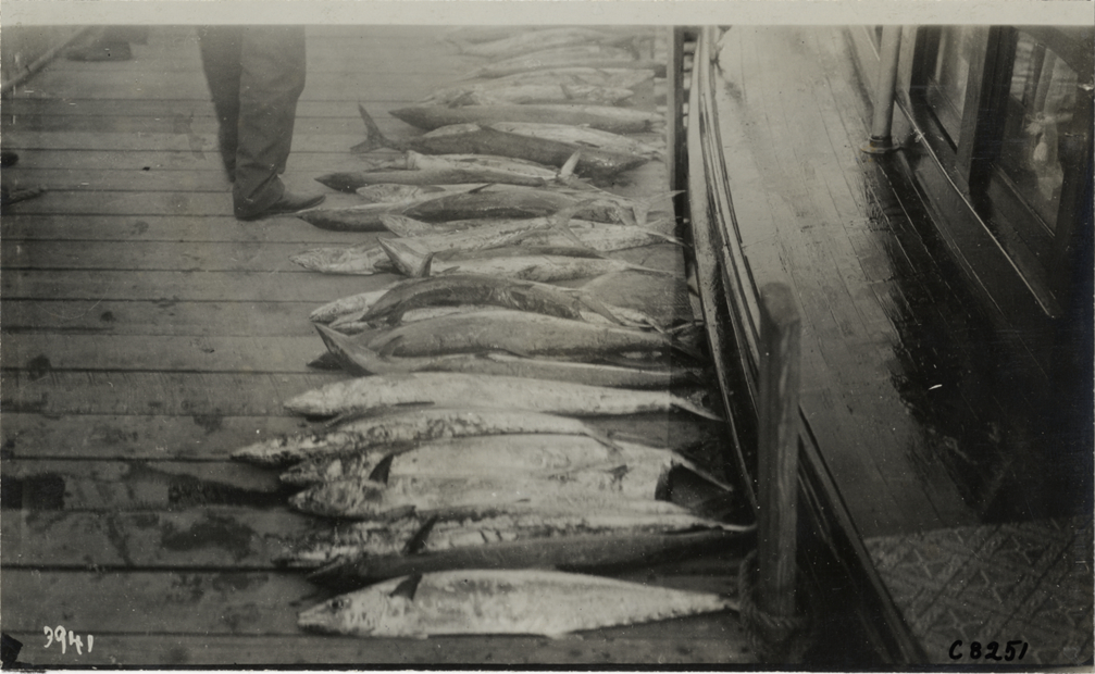 View of row of fish on dock at Palm Beach boat carnival. Stamped on back: "Photo by N. Lazarnick, 29 West 42nd Street, New York." Handwritten on back: "Boats and boating--Palm Beach water boat carnival, 1905."