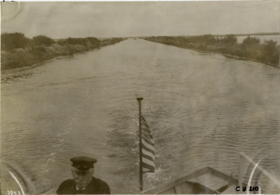 View of man on motorboat at Palm Beach boat carnival. American flag displayed on boat; river or waterway in background. Handwritten on back: "Boats and boating--Palm Beach water boat carnival, 1905."