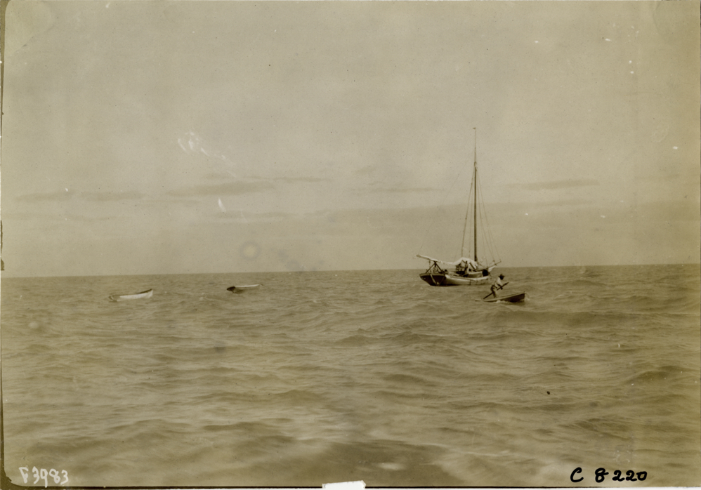 View of sailboat and rowboats at Palm Beach boat carnival. Handwritten on back: "Boats and boating--Palm Beach water boat carnival, 1905."