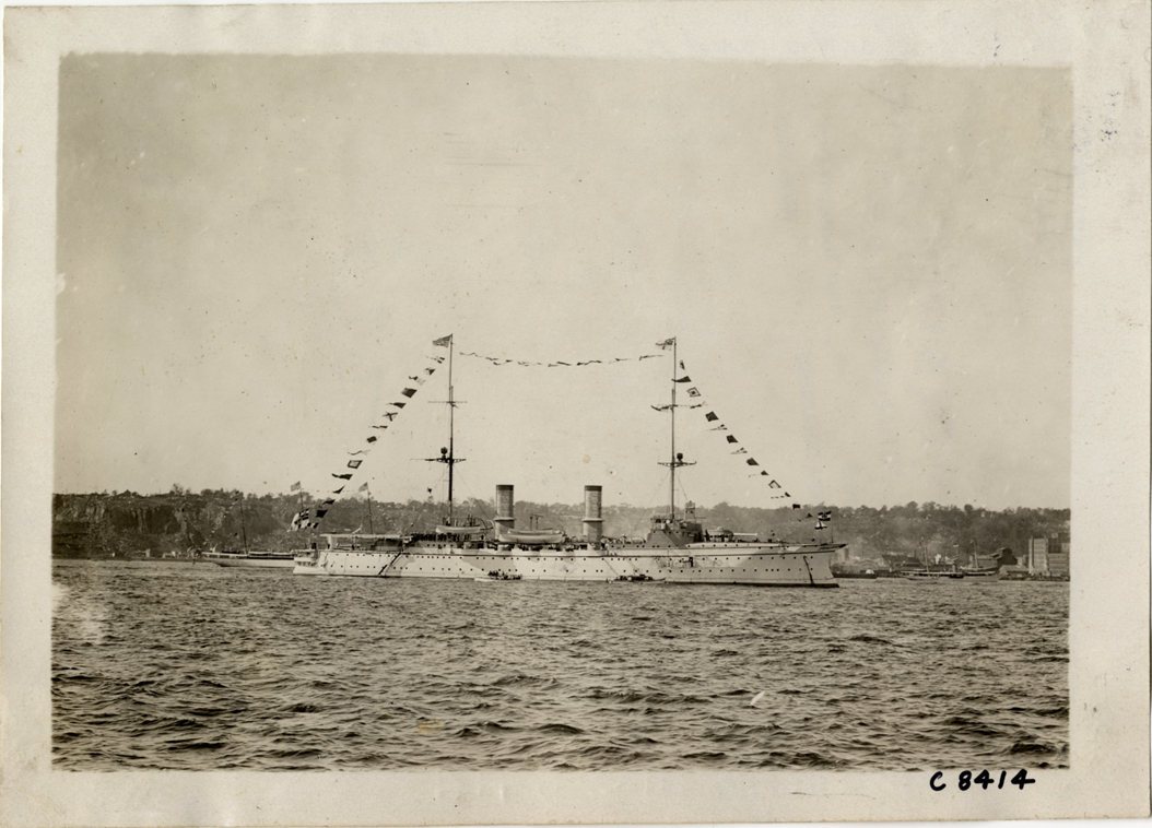 View of steamship decorated with flags during naval parade at Hudson-Fulton Celebration. Stamped on back: "Spooner & Wells, Inc., photographers, telephones 3472-3473 Columbus, 1931 Broadway, New York." Handwritten on back: "Boats and boating--Hudson-Fulton Celebration, naval parade, 1909."