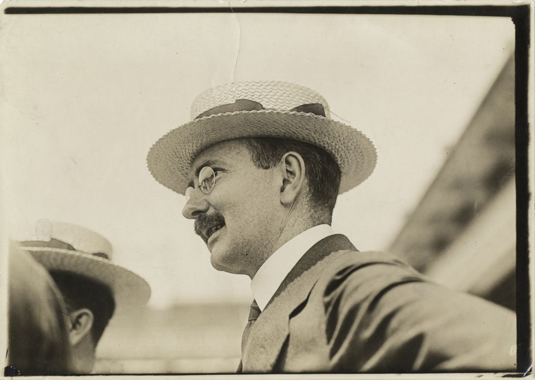 View of Artemas Ward, Jr. wearing straw boater. Handwritten on back: "Biography--Ward, Artemas, Jr. To Artemas Ward Jr., a motor car president who does things on the level."