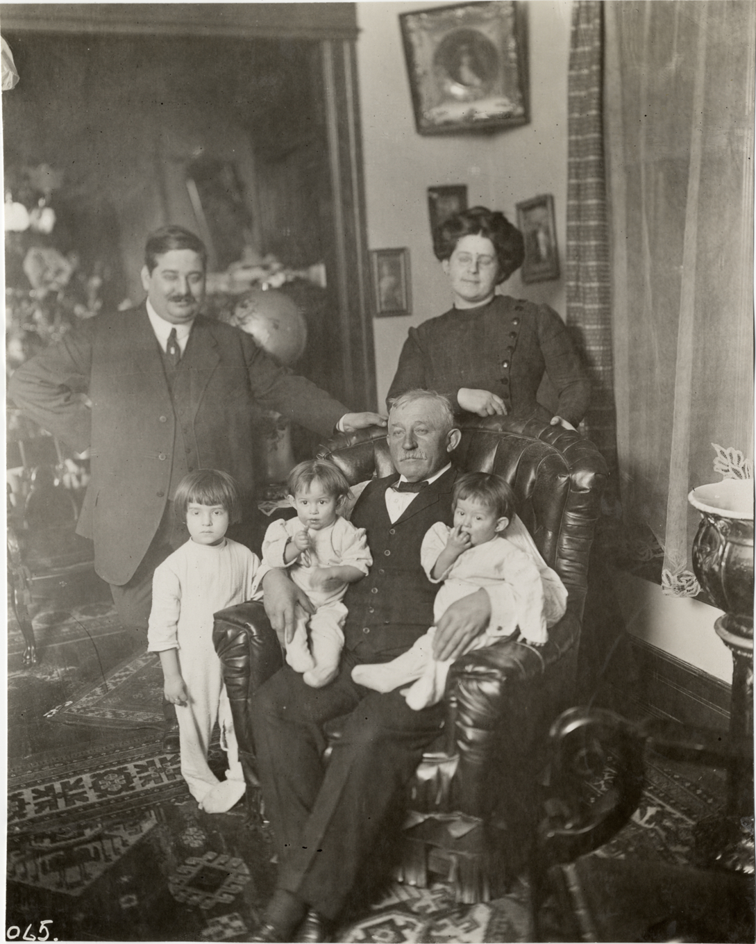 Portrait of elderly man seated in armchair with two young children. Young girl wearing nightclothes stands next to chair; man and woman stand behind chair. Handwritten on back: "Biography--Unidentified, 1910."