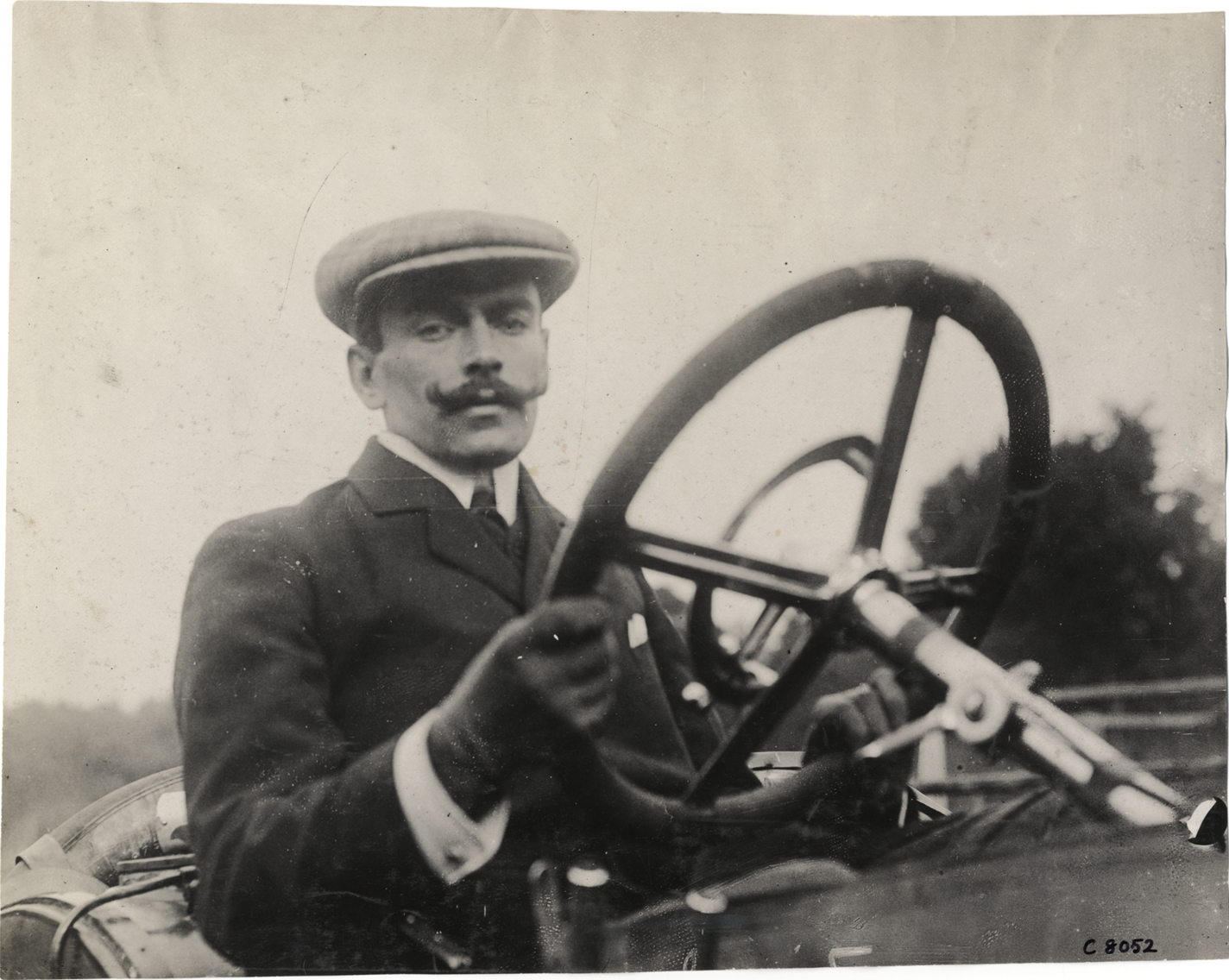 Portrait of Louis Wagner in car at Grand Prize races. Handwritten on back: "Biography--Louis Wagner, picture taken at the Grand Prize races in 1908. Wagner, Fiat."
