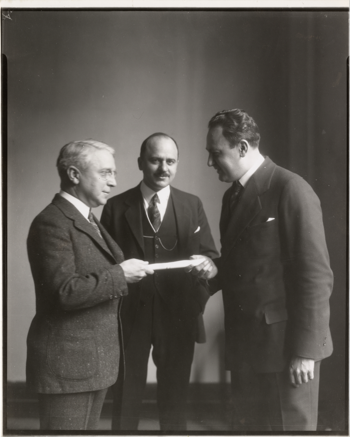 View of John N. Willys, George Bauer and unidentified man. Stamped on back: "Photographic illustration by Nick Lazarnick, 230 Park Ave., N.Y." Handwritten on back: "Biography--Willys, John N. John N. Willys and Geo. F. Bauer presenting?"