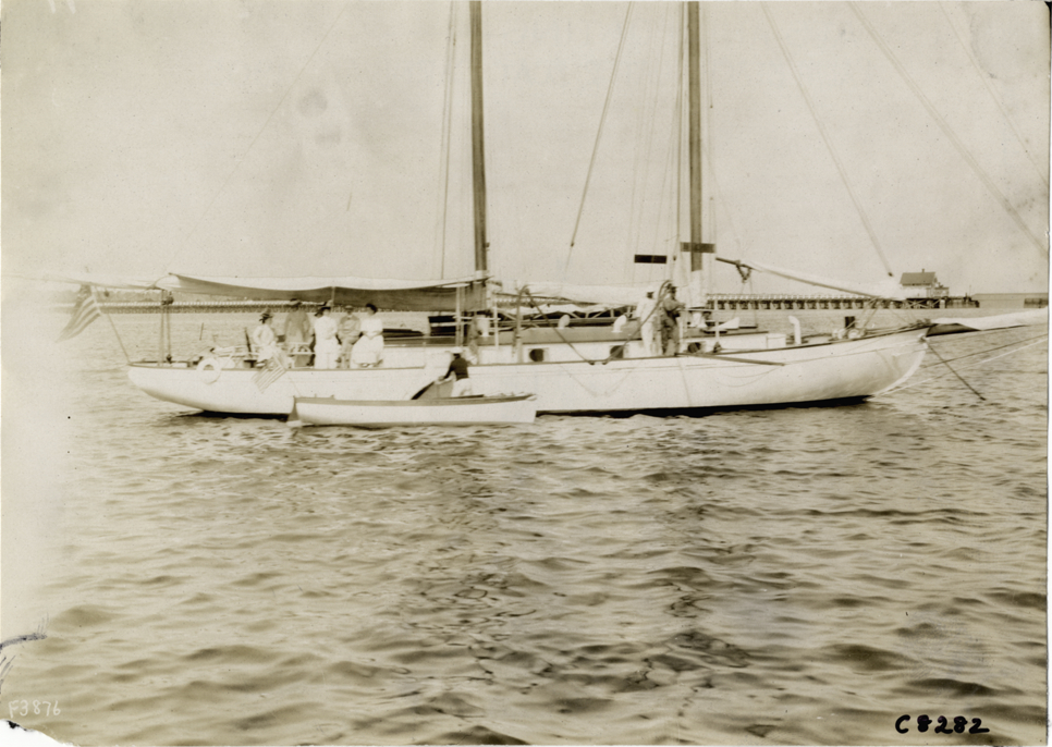 View of sailboat at Palm Beach boat carnival. Man stands in rowboat next to sailboat. Stamped on back: "Photo by N. Lazarnick, 29 West 42nd Street, New York." Handwritten on back: "Boats and boating--Palm Beach water boat carnival, 1905."