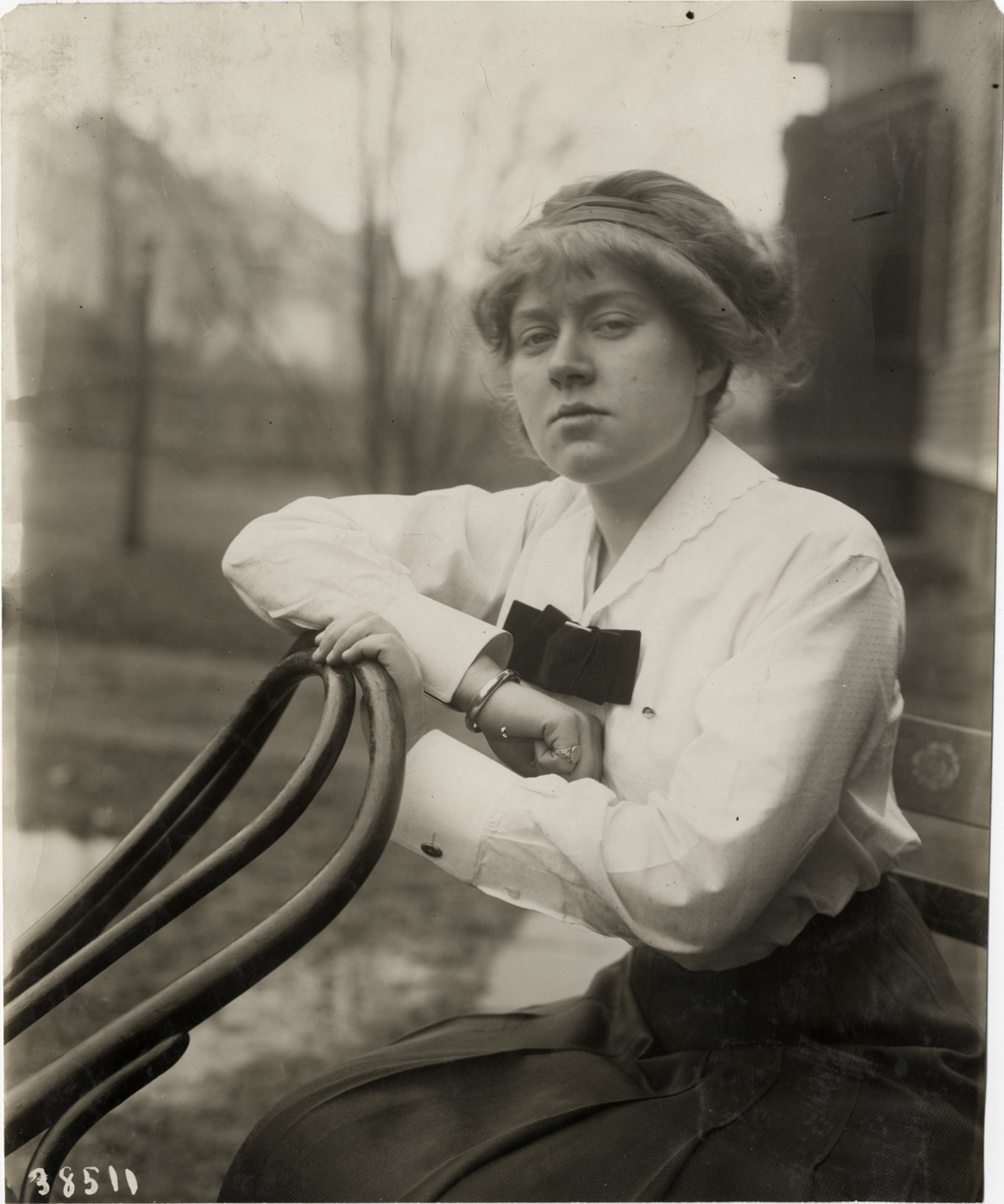 Portrait of a woman leaning on back of chair. Stamped on back: "Spooner & Wells, Inc., photographers, telephones 3472-3473 Columbus, 1931 Broadway, New York." Handwritten on back: "Biography--Unidentified, 1911."
